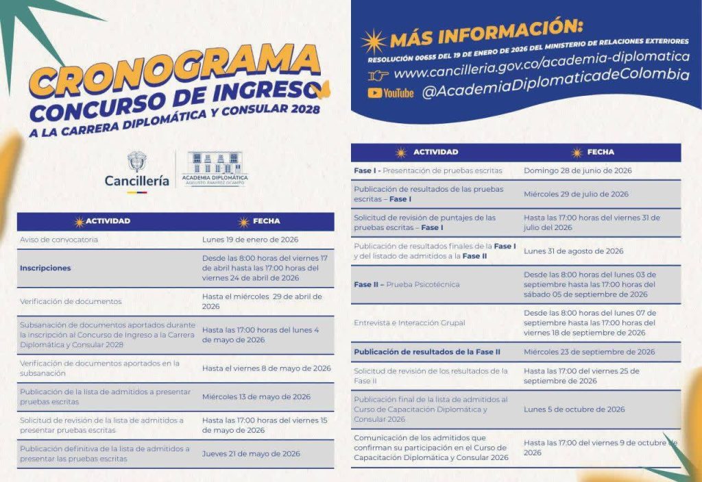 El Ministerio de Relaciones Exteriores de Colombia invita a profesionales colombianos a postularse para el Concurso de Ingreso a la Carrera Diplomática y Consular 2028 donde serán seleccionados hasta 60 profesionales para representar a Colombia en el exterior.