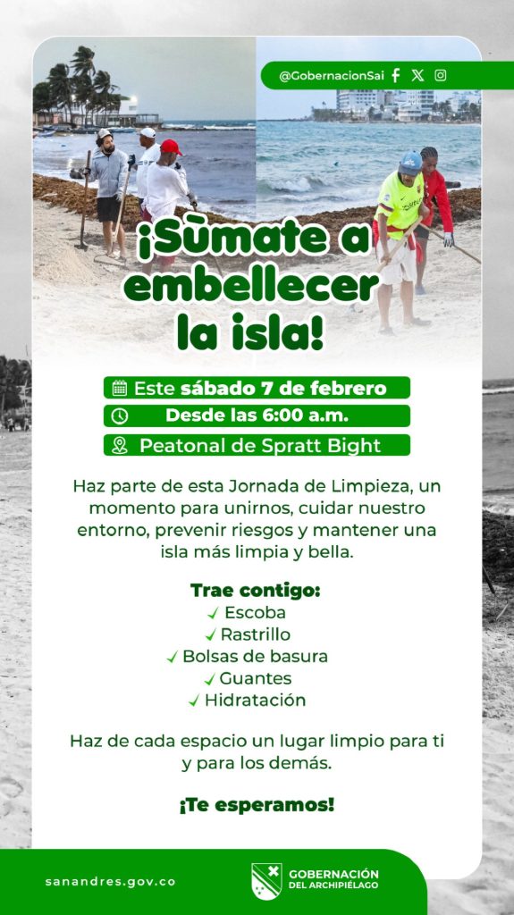 Este sábado 7 de febrero desde las 6:00 a.m. te invitamos a sumarte a la Jornada de Limpieza en la peatonal de Spratt Bight. Será un espacio para unirnos como comunidad, proteger nuestro entorno y mantener a San Andrés limpia y hermosa. 💚